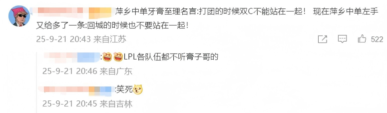 网友们对此纷纷表示:“冥冥之中自有天意,萍乡中单牙膏的名言:打团的时候双C不能站在一起!现在左手又给我们加了一条:回城的时候也不要站在一起。”有趣的是,大家都认为这条经验应该纳入TES的战队警训中,但可惜的是,LPL的各个战队似乎都不愿意听取这位“膏子哥”的忠告。