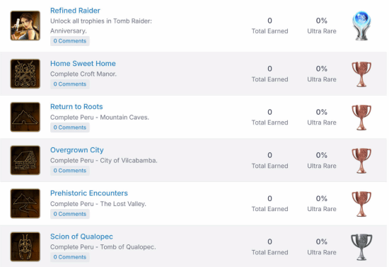 根据外媒Gamerant的报道,PSN最近更新了《古墓丽影十周年纪念版》的完整奖杯列表,其中包括26个不同类型的奖杯,令人振奋的是,还包含了白金奖杯!不过,索尼尚未正式宣布这一移植版的具体情况,奖杯列表的出现也并没有伴随具体的发布日期。