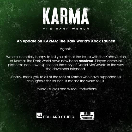 由Pollard Studio开发、Wired Productions发行的心理悬疑游戏《黑暗世界:因与果(KARMA: The Dark World)》今日发布了令人振奋的消息,确认此前在Xbox平台上存在的技术问题现已全部修复。这对于期待已久的玩家来说,无疑是个好消息。